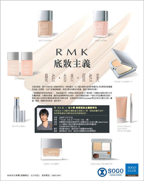 地點 : 銅鑼灣軒尼詩道555號東角中心新翼 SOGO CLUB 16樓 Leisure Corner 內容 : 古小偉親自示範及指導RMK無瑕底妝及 嶄新東瀛彩妝, 完結後參加者可得紀念品一份 查詢 : 請致電香港 2831 4676/於香港 崇光銅鑼灣店RMK專櫃預約